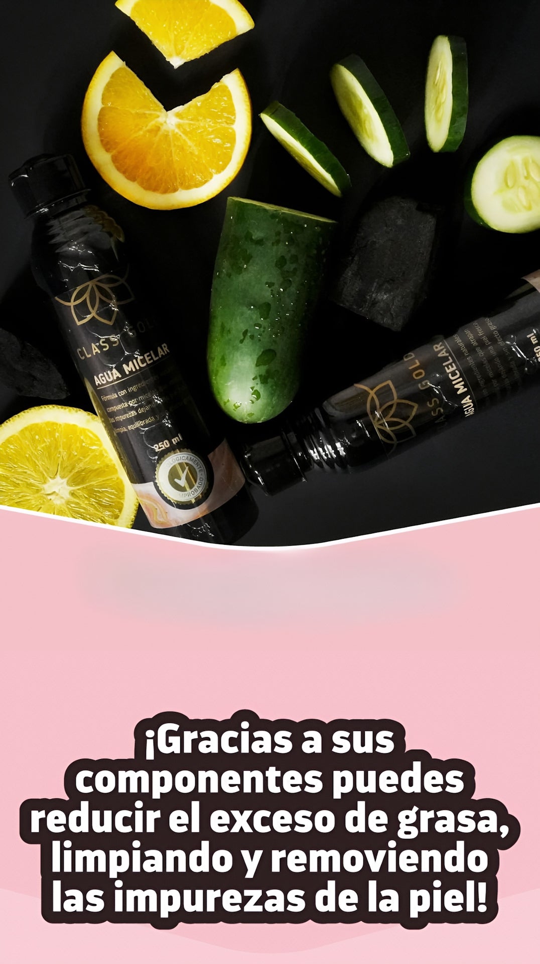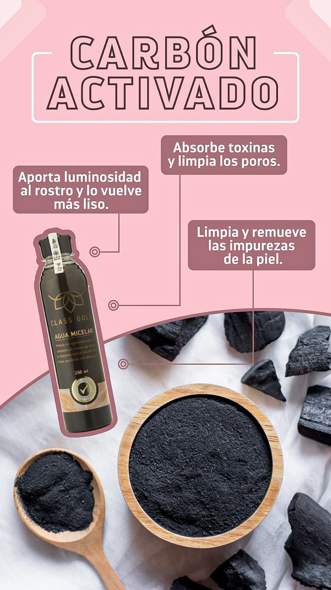 Carbón activo y Micelas: Ayudan a desintoxicar y eliminar las impurezas, aportando luminosidad al limpiar en profundidad la piel.
