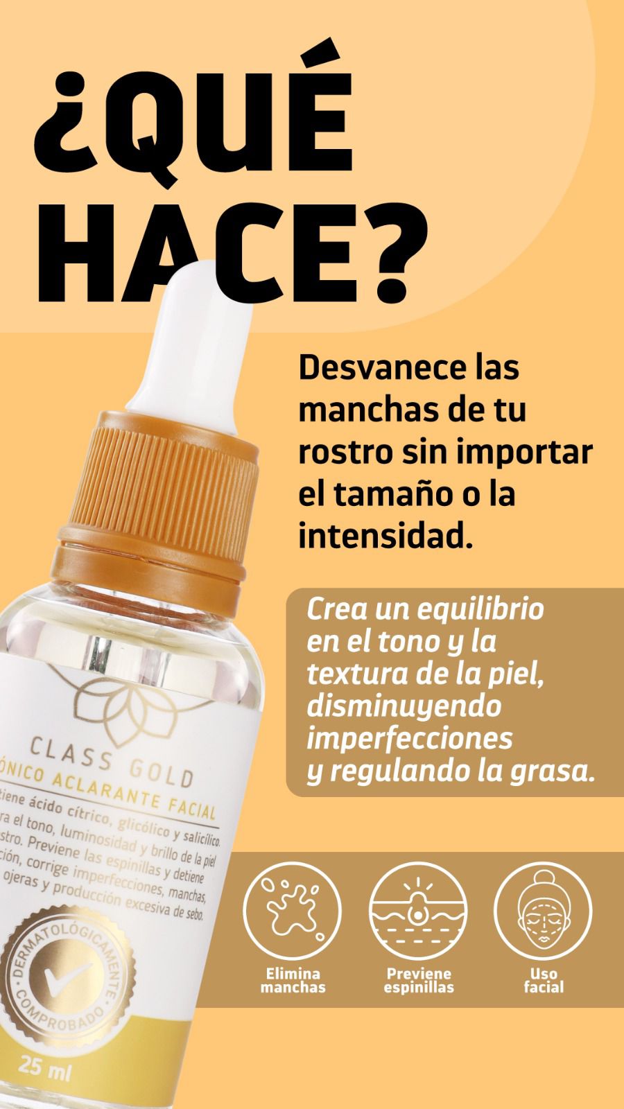 Recupera el tono, luminosidad y brillo de la piel. Detiene la formación de puntos negros y seca los existentes. Disminuye imperfecciones, cicatrices y ojeras.